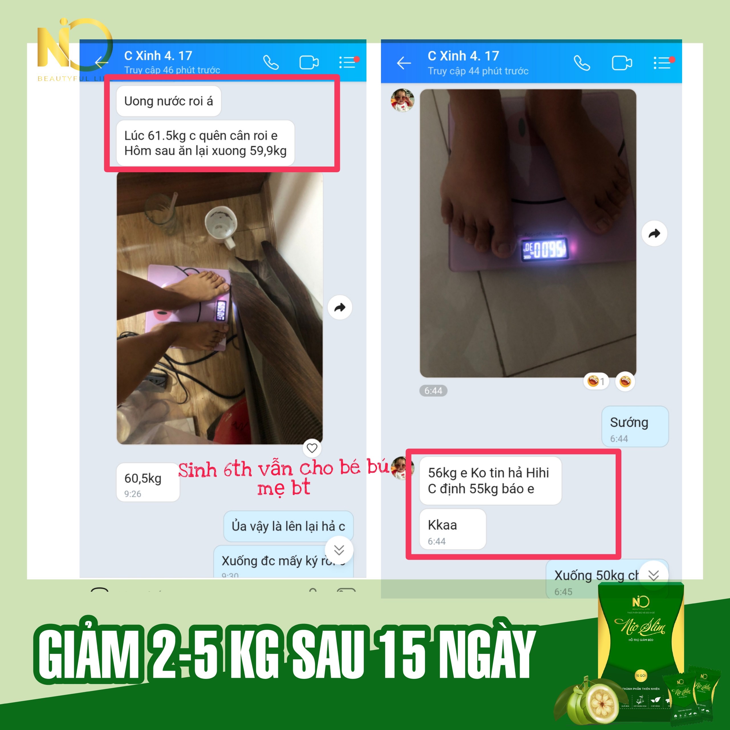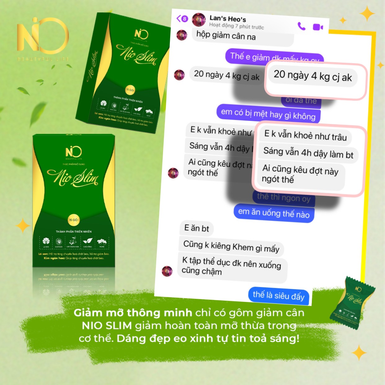 Ở dạng kẹo gôm tiện dụng, hương vị thanh mát, dễ ăn, gôm giảm cân NIO SLIM bước đầu thuyết phục được Ngô Lệ Quyên về tính tiện dụng, càng bất ngờ hơn chỉ sau 1 tuần sử dụng cô đã giảm được 2kg, cơ thể trở nên nhẹ nhàng, thon thả.